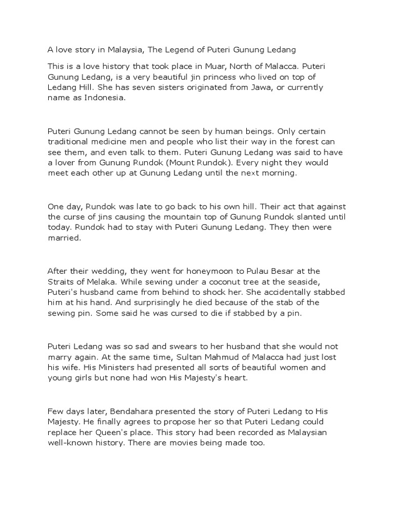 Puteri gunung ledang's nonsensical wishes for those special gifts were just an excuse not to accept the marriage proposal from his majesty the sultan of melaka as she is still loyal to her late husband who died in pulau besar. So please help us by uploading 1 new document or like us to download Puteri gunung ledang (legenda johor). She has seven sisters originated from jawa, or currently puteri gunung ledang cannot be seen by human beings. The legend of gunung ledang revolves around a princess that allegedly lived on mount ophir in johor, malaysia.